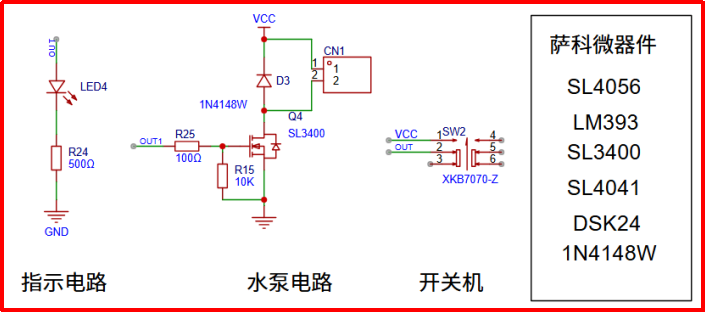 4.1圖一為薩科微運算放大器LM393比較器根據紅外對管感應進行高低電平的比較輸出。該裝置接有薩科微單節鋰電池管理芯片SL4056,通過單節鋰電池供電來驅動負載工作。Type-C給電池充電,充滿電的時候指示燈會熄滅,當手在紅外對管上面揮一下時候,會檢測到障礙物,比較輸出高電平來驅動水泵正常工作,按鍵SW2做開關按下去指示燈亮同時提供照明,該裝置廣泛應用于茶水間,自動上水的時候只需要手往紅外上面揮一揮就能自動加水,非常方便實用。