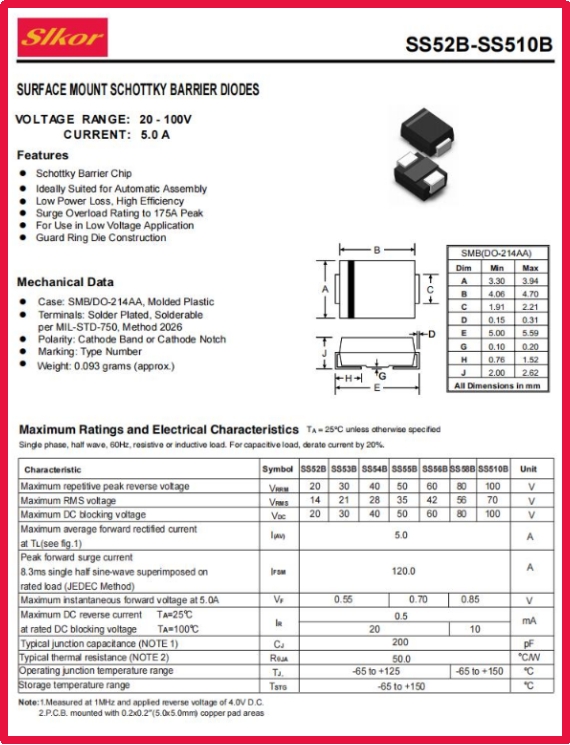 薩科微Slkor肖特基二極管SS54B相關(guān)參數(shù)