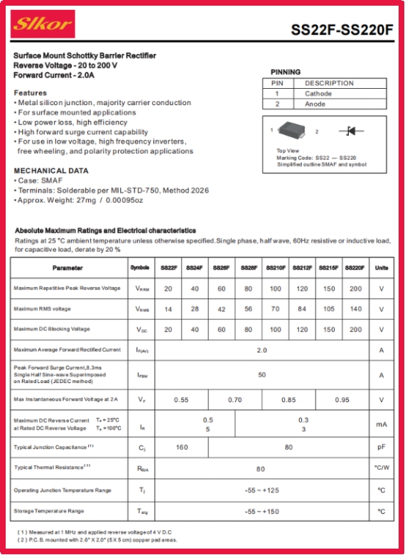 為了確保slkor薩科微肖特基二極管SS24F能夠發(fā)揮出最佳性能,在使用過程中需要注意一些事項(xiàng)。