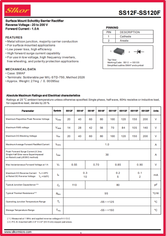 在智能手機快充的瞬間電流控制中,在LED燈帶穩定發光的電源轉換里,在消費電子設備抵御電壓波動的保護機制中,一顆直徑僅3mm的肖特基二極管正默默發揮著關鍵作用。slkor薩科微推出的SS14F,憑借其獨特的性能組合,成為電源管理領域“小而強”的典型代表,為各類電子設備提供了可靠的效率保障。