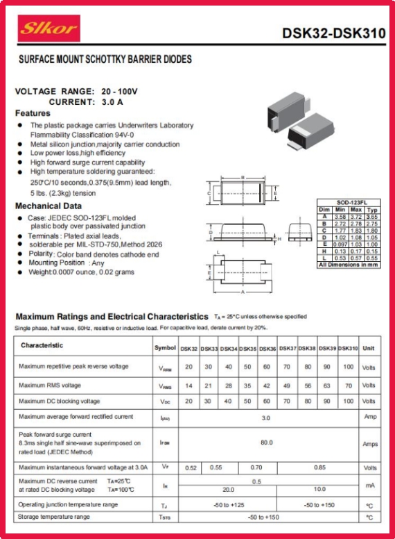 在電子設備不斷追求高效與穩定的今天,一款性能卓 越的半導體器件往往能成為電路設計的“點睛之筆”。薩科微Slkor推出的DSK36肖特基二極管,憑借其獨特的電氣特性與可靠品質,正逐漸成為高頻開關應用領域的“明星產品”。無論是電源轉換、電機控制,還是太陽能逆變與通信設備,DSK36都能以出 色的表現,為電路注入高效與穩定的基因。