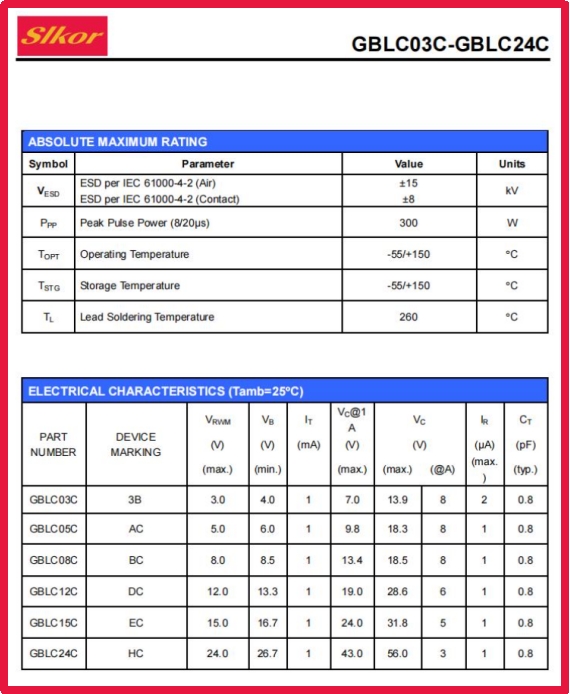 在實際應用中,GBLC05C系列展現出多項卓越特性。其工作電壓范圍覆蓋3V至24V,包括3V、5V、8V、12V、15V和24V多種規格,能滿足不同電路設計的保護需求。產品具有小于1ns的極快響應時間,能在瞬態電壓出現的瞬間立即啟動保護機制;9.8V的低鉗位電壓確保敏感元件不被過壓損壞;1.0μA的超低漏電流特性幾乎不會增加系統功耗,這對電池供電的便攜設備尤為重要;0.8pF的極低結電容使其在保護高速信號時不會影響信號完整性,特別適合高頻應用場景。