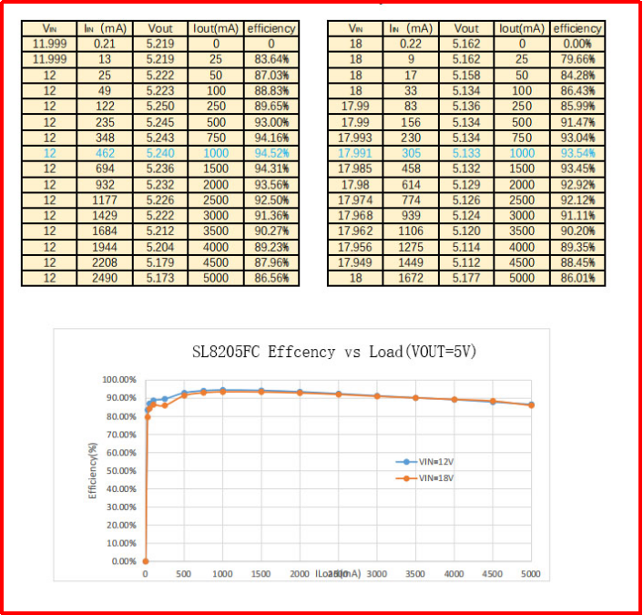 如上圖所示薩科微SL8205FC在測試1A 5V輸出的情況下能效達到93.54%,在輸出電流為3A的時候達到了90%以上,它是非常不錯的一款DC-DC同步降壓芯片。薩科微SL8205FC這顆DC-DC芯片在大電流場景應用非常熱銷,最大電流能達5A。