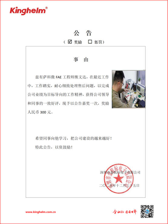 2025年12月22日到2025年12月26日,金航標(www.kinghelm.net)/薩科微(www.slkoric.com)“每周之星”經過同事們評比,金航標/薩科微的“每周之星”是薩科微FAE工程師熊文達,在最近工作中,工作踏實,耐心細致處理售后問題,以完成公司業績為目標導向的工作精神,獲得公司領導和同事的一致好評,現予以公告嘉獎一次,獎勵人民幣300元。