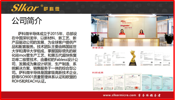 薩科微技術團隊來自清華大學,是國 家級高新技術企業,較早研發出碳化硅功率器件,發展成為集研發、設計、銷售和應用技術服務于一體的公司,企業文化有包容性、開放性和創新性。“SLKOR”品牌已在國際上擁有知名度、美譽度,市場占有率持續攀升,取得ISO9001體系和RoHS、REACH、加州65等認證。