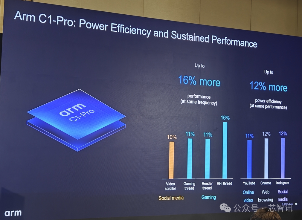 在相關應用測試中,與Cortex-A725相比,C1-Pro CPU在相同主頻下,性能最高提升了16%;在相同性能下,功耗降低了12%。