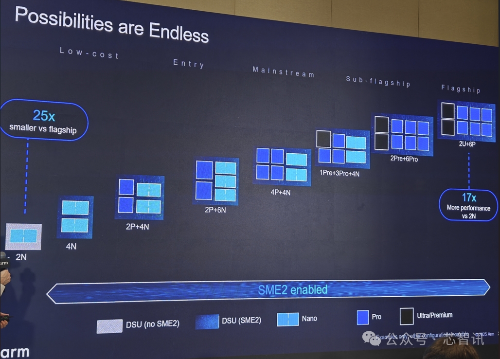 如果拿最低端的2個C1-Nano(基于不支持SME2的DSU)與最高端的2個C1-Ultra + 6個C1-Pro(基于支持SEM2的DSU)對比,后者的性能達到了前者的17倍,不過面積也達到前者的25倍。足見性能、面積跨度之大,還可擴展至各個級別的消費類電子和移動設備,為多樣化的端側工作負載提供不同水平的性能、功耗和面積效率。