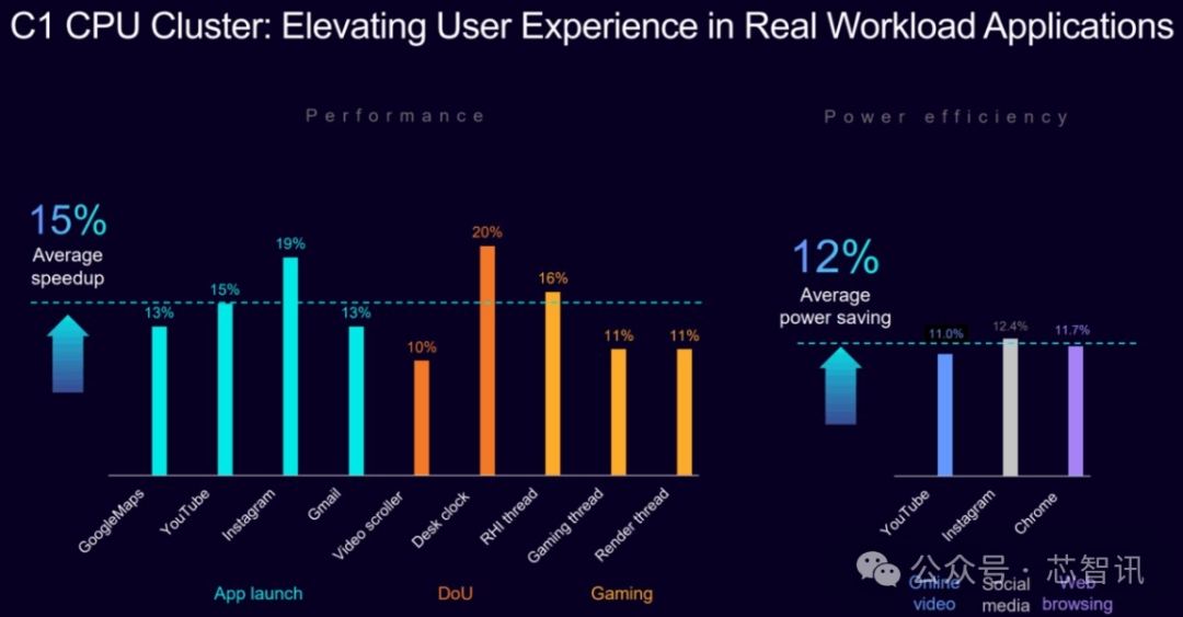 Arm C1 CPU 集群在實際用例中表現突出。在行業領先的性能基準測試,該 CPU 集群在同等條件下,相較于上一代 CPU 集群性能平均提升 30%,在游戲和視頻流媒體等應用中平均提速 15%。與此同時,在日常移動端工作負載(如視頻播放、社交媒體、網頁瀏覽)中,該 CPU 集群在同等條件下,相較于上一代 CPU 集群功耗平均降低 12%。