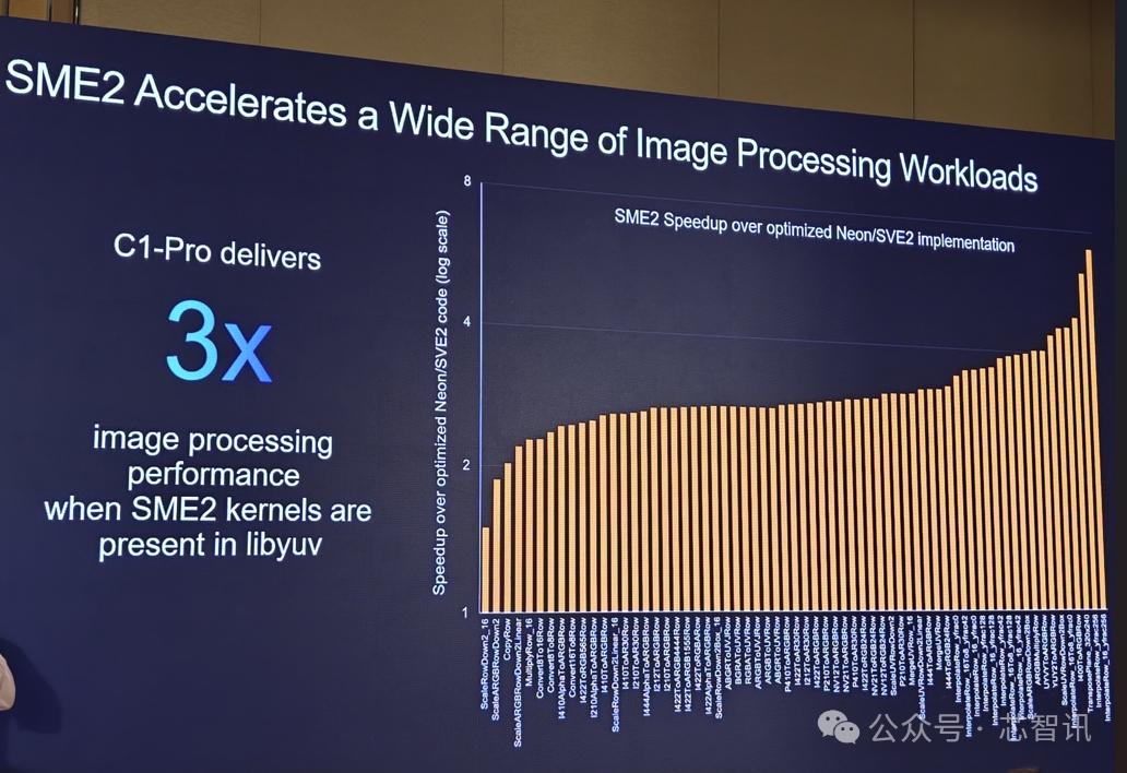 SME2 還可加速各種圖像處理工作負載,比如在libyuv中,支持SME2的C1-Pro的圖像處理表現提升到了原來的3倍。