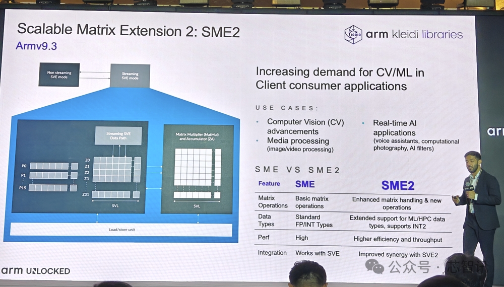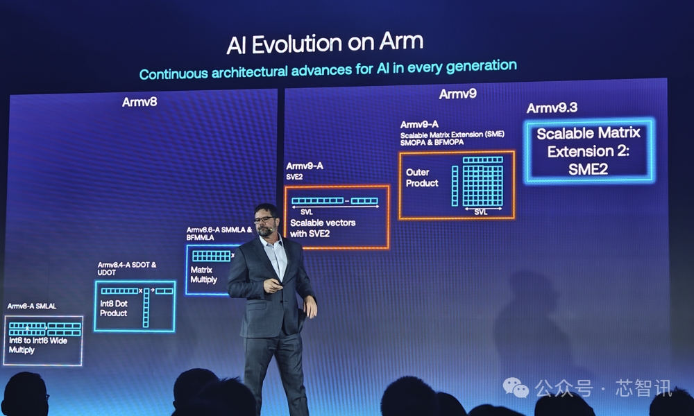 進入到 Armv9 架構,Arm在 CPU 上集成了用于加速和保護如大語言模型 (LLM) 等先進的生成式 AI 工作負載的特性。比如,Armv9-A 加入了可伸縮矢量擴展 2 (SVE2),用于數字信號處理器 (DSP)、媒體和通用矢量化;Armv9.2-A 則首次引入了可伸縮矩陣擴展 (SME)指令,可加速 AI 和 ML 工作負載,并為 Arm CPU 上運行的 AI 和 ML 應用提供更高的性能、能效和靈活性。