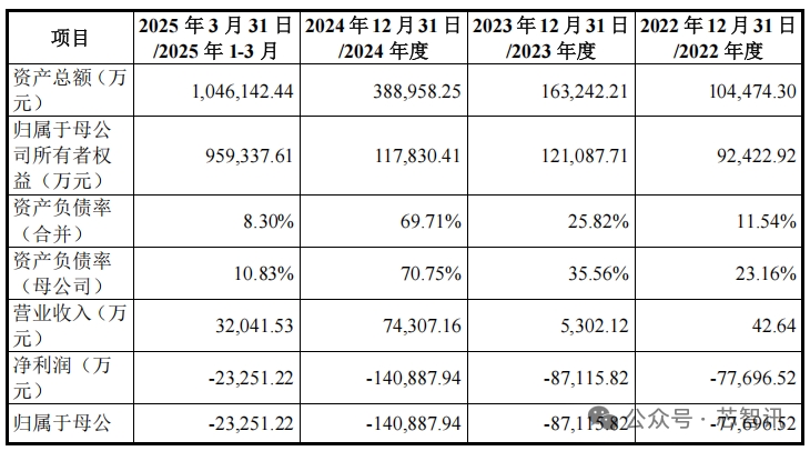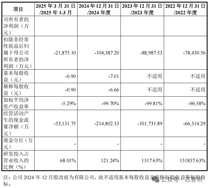 2022年、2023年、2024年、2025年一季度(以下簡稱“報告期”),沐曦股份營業(yè)收入分別為 42.64 萬元、5,302.12 萬元、74,307.16 萬元和 32,041.53 萬元,近13個季度累計營收約11.17億元;歸屬于母公司所有者的凈利潤分別為-77,696.52 萬元、-87,115.82 萬元、-140,887.94 萬元和-23,251.22 萬元,尚未實現(xiàn)盈利。累計近13個季度虧損額約32.9億元。