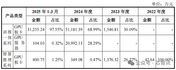 從沐曦股份公布的營收來源看,2023 年度、2024 年度和 2025 年 1-3 月,,沐曦股份的訓(xùn)推一體GPU板卡的銷售額占比也是持續(xù)快速提高,各期占比分別為30.09%,68.99%和97.55%。這也進(jìn)一步反應(yīng)了沐曦股份的營收對于訓(xùn)推一體芯片曦云 C500系列的高度依賴。