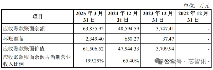 報告期各期末,沐曦股份應(yīng)收賬款賬面價值分別為 0 萬元、3,709.94 萬元、47,944.33 萬元和 61,506.52 萬元,占各期末流動資產(chǎn)的比例分別為 0%、2.91%、14.00%和 6.13%,占同期營業(yè)收入的比例分別為 0%、69.97%、64.52%和 191.96%。