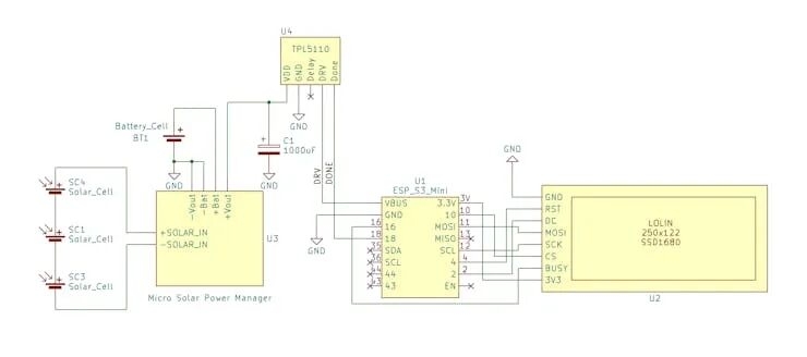 • 電源鏈路:太陽能板 → SPV1050 → 電池 → TPL5110 →(系統電源)→ ESP32-S3 & 墨水屏。