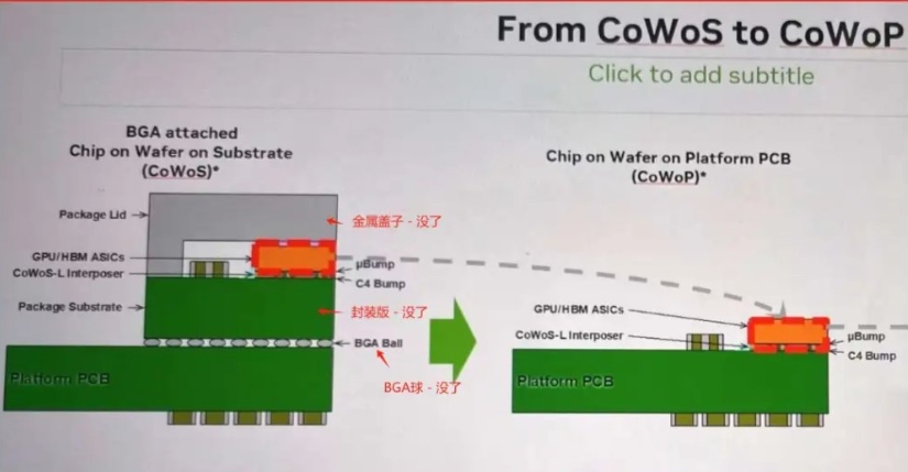 • CoWoP 的核心思路就是把這個封裝基板去掉 —— CoWoP = CoWoS - 封裝基板。中介硅片 + 芯片直接安裝在增強型主板上,不再走傳統封裝那一層。