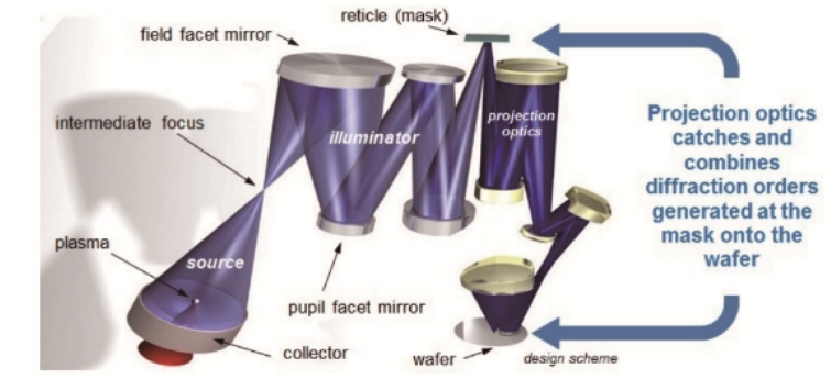 2. 照明系統(tǒng)(Illumination System): 它不是簡單的把光照過來,而是對光源發(fā)出的光進行整形、勻化,并以特定的角度(如離軸照明 OAI)照射到掩模版上,以優(yōu)化最終成像的對比度和清晰度。以下是EUV光刻照明和物鏡示意圖: