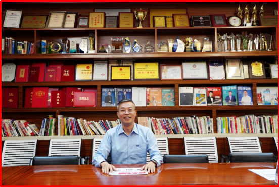 陳總身后一整面墻的書籍刊物、獎杯證書