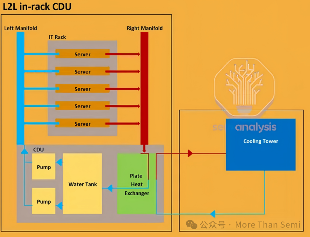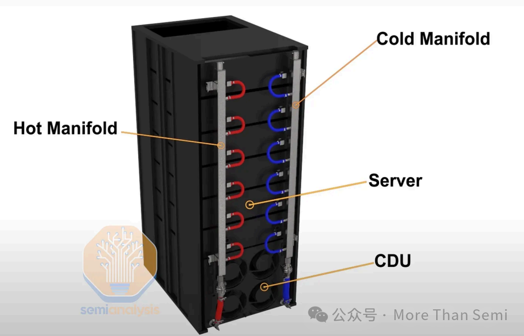 下面的圖是一個(gè)GB200 NVL72機(jī)架的簡(jiǎn)易示圖,可以看到Manifold左右兩側(cè)的顏色是不一樣的,藍(lán)色表示里面的冷側(cè)歧管,也就是上面圖中的Left Manifold,來自CDU的低溫冷卻液在此分路,送往各服務(wù)器的冷板;紅色表示熱側(cè)歧管,也就是上面圖中的Right Manifold,服務(wù)器冷板流出的高溫冷卻液在此匯總,回流至CDU。