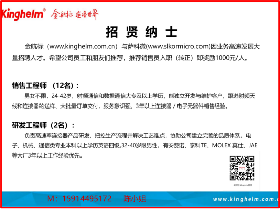 金航標Kinghelm(www.kinghelm.com.cn)電子成立于2007年在深圳市華強北,是研發、生產、銷售、技術服務一體化發展的國家高新技術企業,十多年來深耕射頻微波技術,研制信號收發傳輸產品組件,產品包括北斗GPS天線、各系列連接器接插件端子臺、天線連接器接插件的開模定制以及配套的解決方案,“Kinghelm”(www.kinghelm.net)品牌在國內和國際有影響力和美譽度!金航標創始人暨董事長宋仕強先生介紹道,“金航標,連接世界”,金航標公司技術骨干來自清華大學,吸納電子科技大學和海歸技術人才,做到東莞塘廈的研發部、廣西鹿寨縣工廠、深圳市龍華區中轉倉、龍崗總部的銷售部供應鏈部,都和客戶的產品需求信息同步對應,實現了協同化、數字化、智能化、流程化管理,成為電子信息行業非常有競爭力的公司!金航標與同為宋仕強先生投資經營的薩科微Slkor半導體(m.jj-led.cn)一起為電子整機產品公司提供配套服務,成為全世界超過15000家客戶的合作伙伴,致力于“走國產化與國際化之路,爭取成為半導體領導者”!宋仕強:國務院經濟發展中心民營經濟研究員,中國科學技術協會電子信息專家庫成員、華強北商業研究專家。宋仕強曾任某國際地產上市公司CEO,現投資經營深圳市薩科微半導體有限公司與深圳市金航標電子有限公司,兩家企業均是國家級高新技術企業,原創性獲得發明專利和軟件著作權幾十項。宋仕強在電子行業耕耘多年,為深圳市華強北更好的營商環境在不斷努力,希望華強北成為改革開放的窗口和深圳經濟發展的名片。