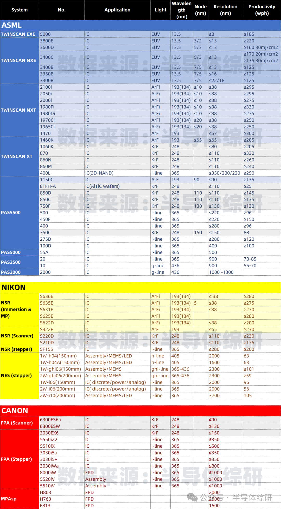 ASML、NIKON、CANON光刻機型號參數(shù)匯總