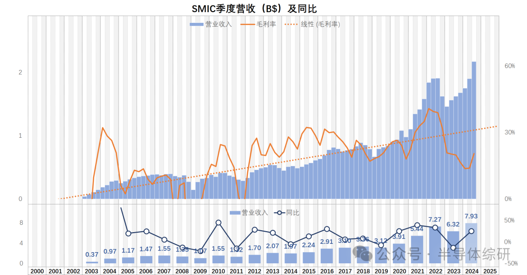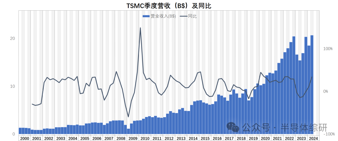 最近一段時間,雖然半導體行業(yè)已經(jīng)明確走出谷底,但反彈力度不足,整個行業(yè)的景氣度依舊不高。所以不少朋友也不斷和我探討行業(yè)后續(xù)的發(fā)展究竟會如何變化 要了解透半導體行業(yè)的現(xiàn)狀和未來,我們需要觀察和分析的數(shù)據(jù)是非常多的。不過,從宏觀角度上看,我首先會建議所有人先自己研究一下兩家晶圓代工廠的財務數(shù)據(jù): 第一家自然就是臺積電(TSMC)。作為行業(yè)絕對的龍頭,他的營收基本代表了半導體行業(yè)整體的態(tài)勢。尤其在高端工藝,臺積電處于完全壟斷狀態(tài)。他的高端工藝的財務數(shù)據(jù)直接代表了先進產(chǎn)品的行情 第二家則是臺聯(lián)電