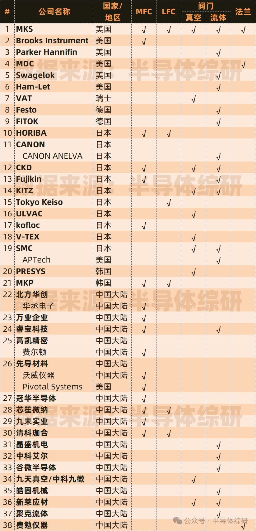 整理一下半導體設備配件供應商數(shù)據(jù):流體控制、閥門件...