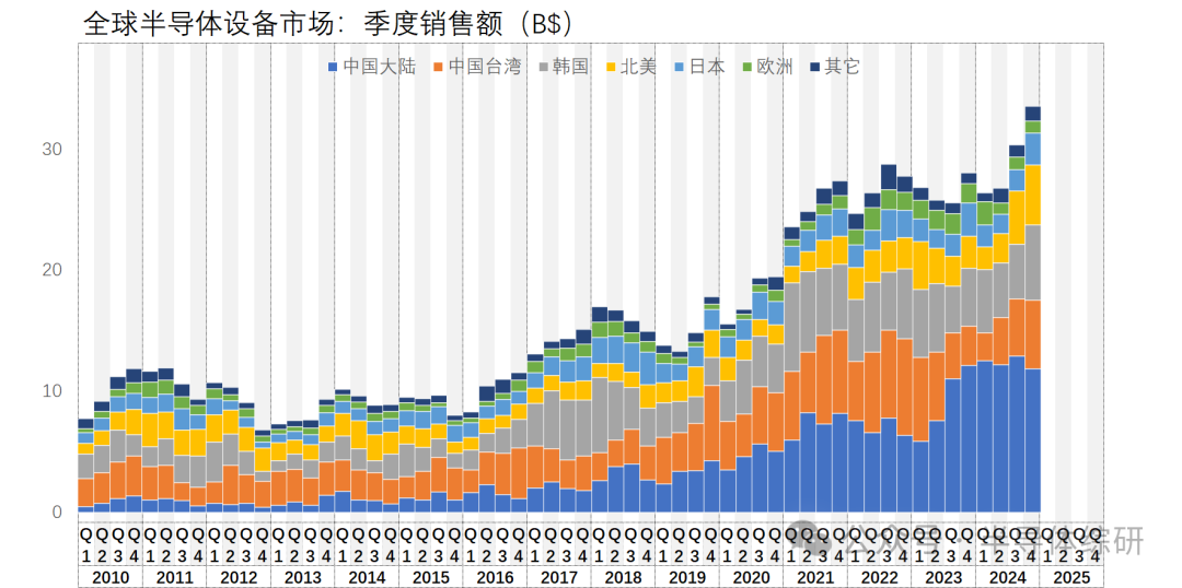 最近,SEMI公布了2024年全球半導體設備市場數(shù)據(jù):1171億美金,較2023年增加了10.2% 很明顯,2024年全球半導體設備最大的市場是中國大陸。不過隨著建廠周期的變化遷移,2025年市場會暫時向中國臺灣和韓國遷移 我也把把全球主要的10家半導體設備供應商的財務數(shù)據(jù)整理好了,供大家參考一下 特別說明: 1. 本數(shù)據(jù)僅僅統(tǒng)計各家公司的半導體領域相關設備的營收(設備本體+相關服務收入),不包含面板、光伏、SMT等領域收入 2. 部分數(shù)據(jù)包含